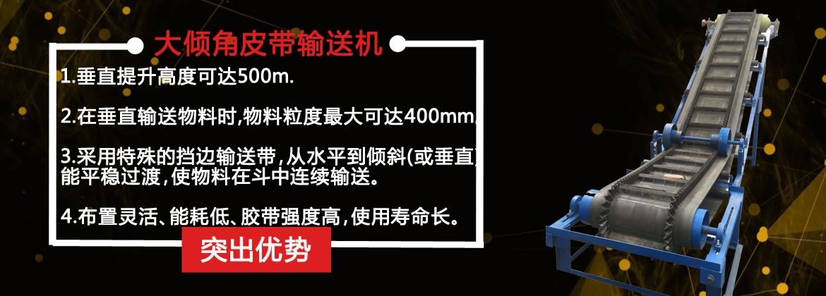 1.大傾角輸送散狀物料,能大量節(jié)省設(shè)備占地面積,徹底解決普通、花紋皮帶輸送機(jī)所不能達(dá)到的輸送角度。
