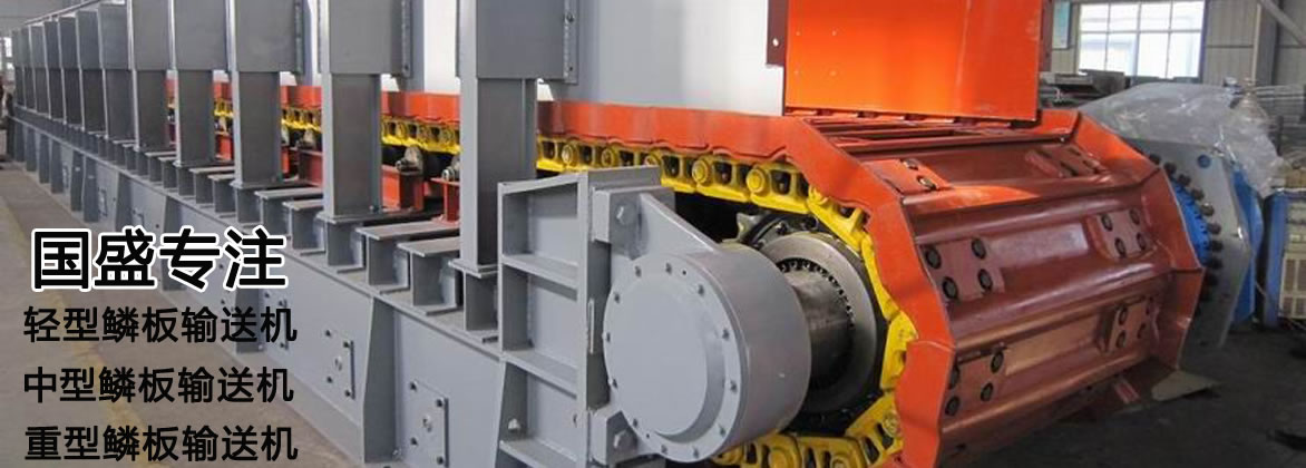 鱗板式輸送機采用節(jié)距高強度模鍛鏈條為牽引件,兩根鏈條繞過安裝在機體頭部的一對驅動鏈輪和機體尾部的一對張緊輪聯(lián)成封閉形回路,在兩排鏈條的每個鏈節(jié)上裝配了相互交迭的、重型結構的輸送槽而成為一個連續(xù)的能夠運載物料的輸送線路。其自重和物料的重量由安裝在機體上的多排支重輪、鏈托輪和滑道梁支承。傳動系統(tǒng)經(jīng)交流變頻調速電動機聯(lián)接減速機,再由漲套與驅動裝置直聯(lián)驅動運載機構低速運行。將尾部料倉卸入的物料沿輸送線路運至機體的前方排出,通過鏈條的傳動將鱗板上的物料輸送到卸料處,實現(xiàn)向下方的工作機械連續(xù)均勻輸送的目的。