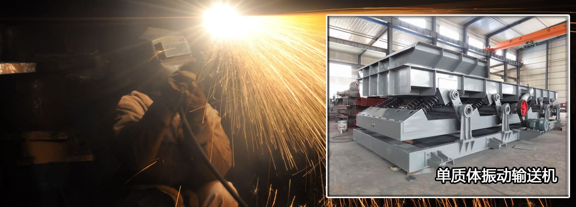 SSL共振式振動(dòng)輸送機(jī)是利用激振器使料槽振動(dòng),從而使槽內(nèi)物料沿一定方向滑行或拋移的連續(xù)輸送機(jī)械。激振器在電機(jī)驅(qū)動(dòng)下產(chǎn)生周期性振動(dòng)力,通過(guò)傳動(dòng)機(jī)構(gòu)傳遞到輸送槽,輸送槽在激振源的帶動(dòng)下按激振源相同的振動(dòng)頻率產(chǎn)生周期性線性振動(dòng),同時(shí)振動(dòng)力方向與輸送槽體輸送方向呈一定的拋料角,槽內(nèi)物料在強(qiáng)迫振動(dòng)力的作用下沿槽體輸送面連續(xù)跳躍向前移動(dòng)。除激振機(jī)構(gòu)某些零部件外,相對(duì)轉(zhuǎn)動(dòng)部件很少。物料在振動(dòng)輸送機(jī)中呈現(xiàn)拋射狀態(tài)輸送,對(duì)輸送槽的磨損較小。