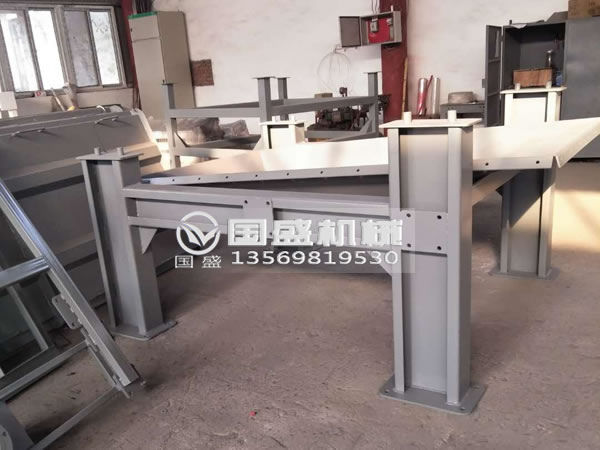 篩板材質(zhì)為304條縫篩板,篩孔為5mm,采用條縫橫向布局,2臺(tái)振動(dòng)電機(jī)型號(hào)為YZS-20-6,電機(jī)功率為1.5kw,篩機(jī)安裝傾角為5°,由于污泥需要進(jìn)行清洗,因此脫水篩上方建議安裝沖洗管道,篩機(jī)主體和積水槽之間的材質(zhì)采用帆布軟連接,沖洗管道及布料器和篩機(jī)無(wú)硬連接,支撐架的作用是為了支撐沖洗管管路及布料器,上蓋和篩機(jī)采用快開箱口。